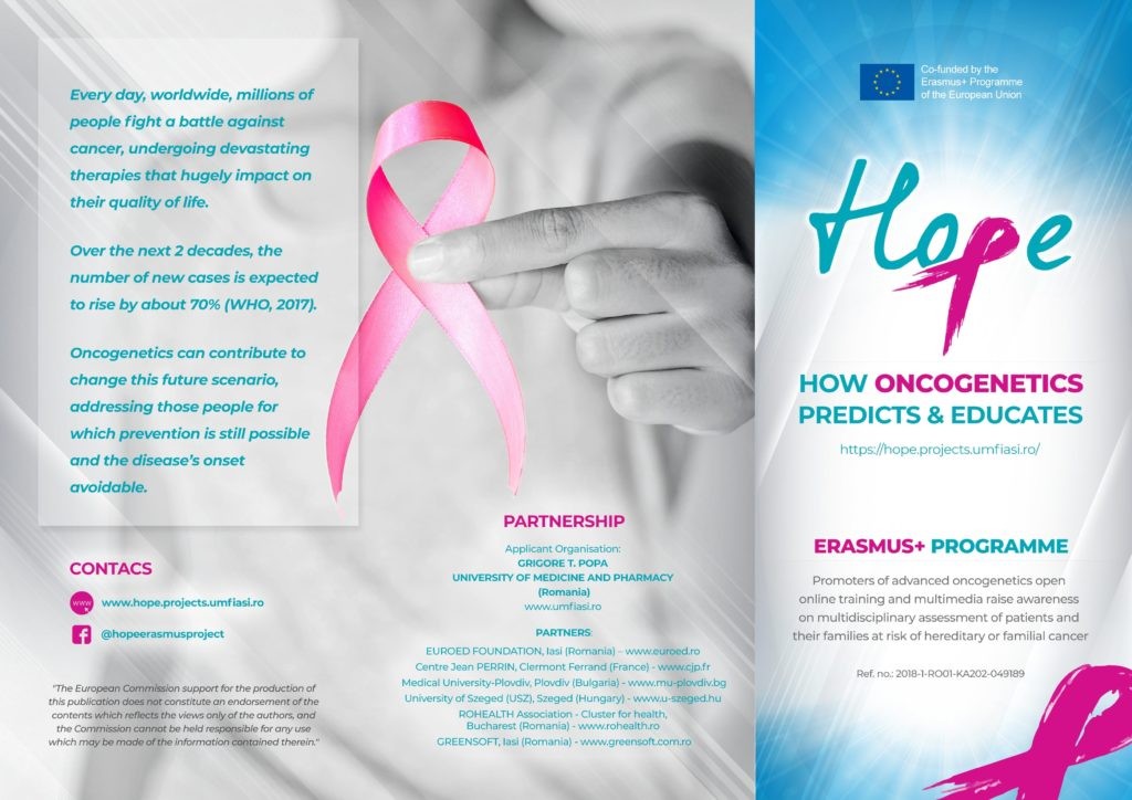 Proiectul HOPE - How Oncogenetics Predicts & Educates, 2018-1-RO01-KA202-049189, finantat prin programul Erasmus+, sustine parteneriatele strategice pentru educație și formare profesională, precum si cooperarea pentru inovare și schimbul de bune practici, in domeniul oncogeneticii.
